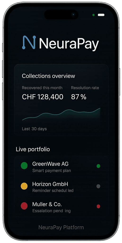 NeuraPay is an AI-native debt resolution platform. It automates the full journey from first reminder to settlement or legal handover – and turns collections into a modern, data-driven product instead of a manual back-office process.